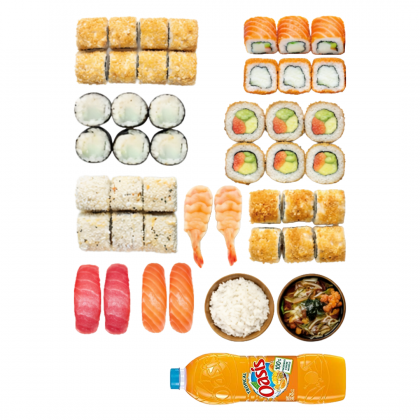 8 sushi panés au choix (poulet, crevette, tempura ou saumon cuit), 6 salmon roll cheese, 6 californias saumon avocat, 6 crispy rolls poulet pané, 6 snow rolls thon cuit, 6 makis cheese, 2 sushis saumon, 2 sushis thon, 2 sushis crevettes, 2 accompagnements au choix, boisson au choix Coca 1,5L ou Oasis 2L